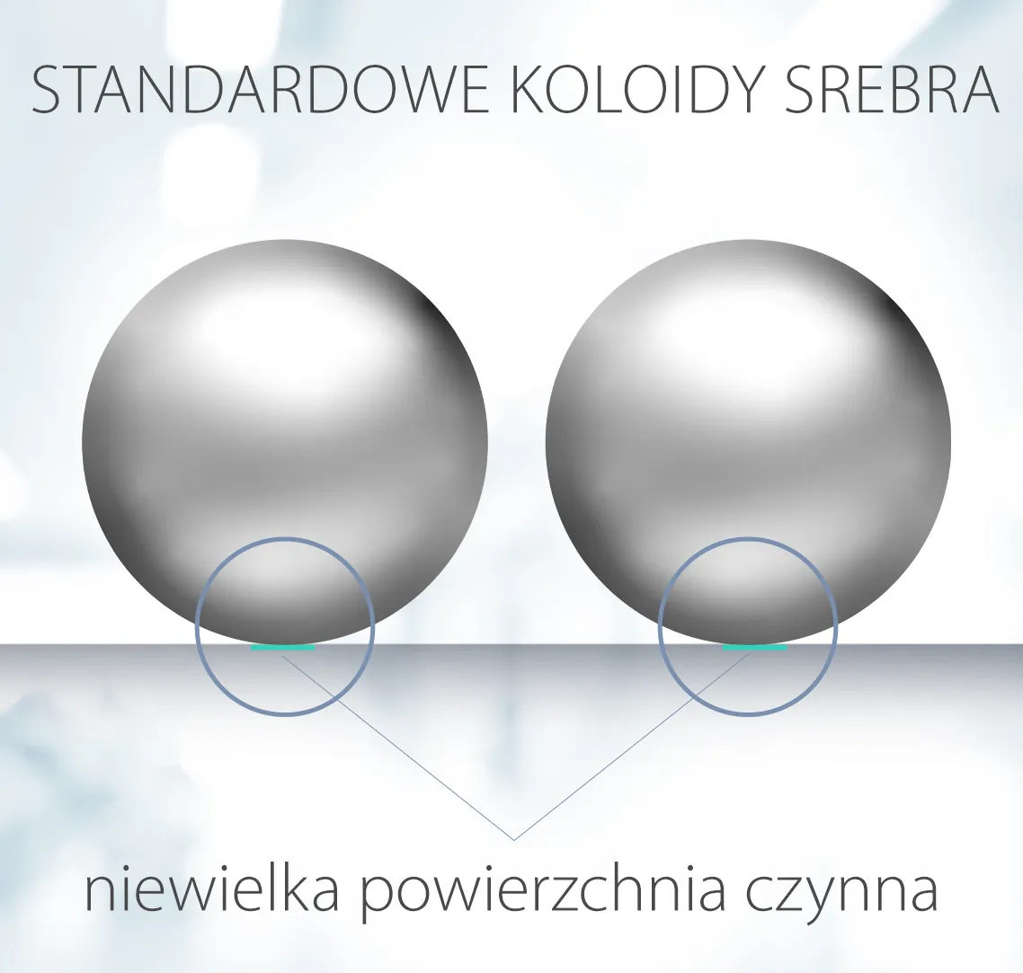 Jak widać na grafice, rzeczywista powierzchnia styku tych koloidów jest bardzo mała i mało skuteczna, takiego srebra nie polecamy.