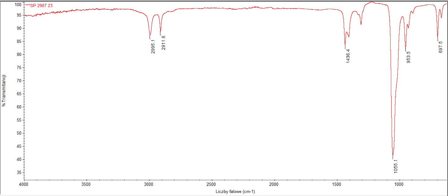 Widmo FTIR uzyskane podczas badania próbki jest zgodne z widmem charakterystycznym dla dimetylosulfotlenku.Dla liczby falowej 2995 cm−1 i 2911 cm−1 obserwujemy pasma odpowiadające za drgania rozciągające wiązania C-H . Pasmo 1436 cm−1 odpowiada drganiom deformacyjnym wiązania C-H występującym w grupie metylowej. Pasmo 1055 cm−1 odpowiada drganiomrozciągającym wiązania S=O występującym w sulfotlenkach.