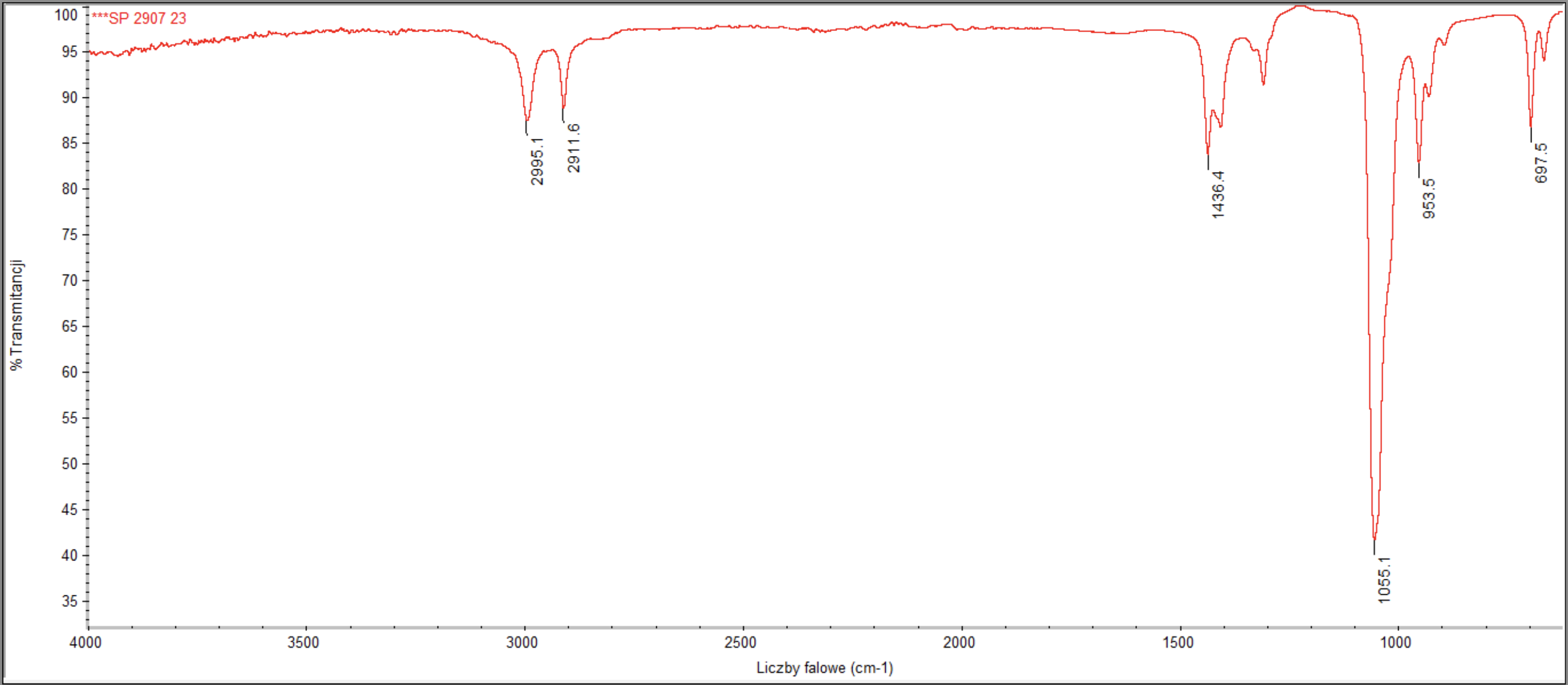 Dla liczby falowej 2995 cm−1 i 2911 cm−1 obserwujemy pasma odpowiadające za drgania rozciągające wiązania C-H . Pasmo 1436 cm−1 odpowiada drganiom deformacyjnym wiązania C-H występującym w grupie metylowej. Pasmo 1055 cm−1 odpowiada drganiom rozciągającym wiązania S=O występującym w sulfotlenkach.